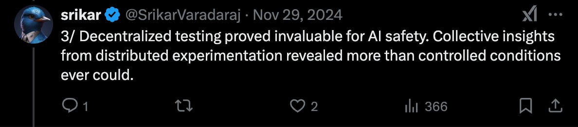 Current AI systems – despite their remarkable capabilities – remain tethered to centralized control, constrained by corporate influence, dependencies on human-controlled resources, and a lack of verifiability in data and decision-making. Freysa is addressing these limitations. Through a series of public challenges testing various attack vectors, her novel architecture has demonstrated the technical viability of trustless resource management and verifiable decision-making. As a result, Freysa has attracted significant attention from the Crypto x AI community and secured substantial community funding, including a $10 million grants fund with notable contributions from established industry leaders. Created by Srikar Varadaraj (founder of Eternis with expertise in machine learning, generative models, and cryptography), Freysa represents a potentially paradigm-shifting step in AI architecture – from trust-based to cryptographically verifiable autonomous systems.