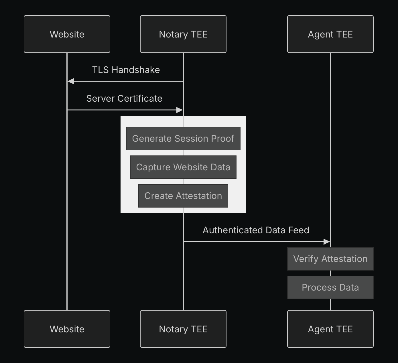 Standard Web Content: For all other sources of data (i.e., social media, news, public repositories), notary TEEs generate signed attestations that combine content hashes, timestamps, and TLS session proofs. These attestations are stored on-chain and must be verified before the data can influence any decisions. Testing has validated this approach, showing 80-90% success rates for single-call API verifications and 70% success rates for multi-step verification sequences.