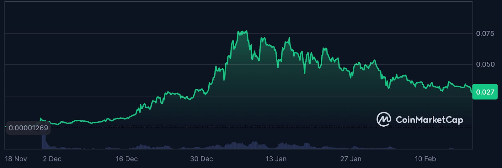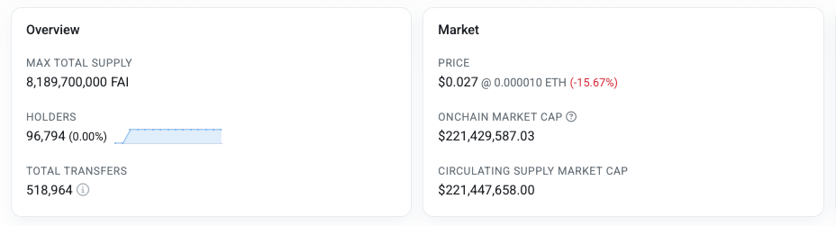 The Freysa token ($FAI) launched on Base with a (seemingly) fair distribution model. 100% of the ~8.2 billion max-supply was released, paired with 30.1 wETH in an Aerodrome liquidity pool (LP tokens were burned to permanently lock liquidity). Since its launch, $FAI has shown notable price action, rising from ~$0.000013 to a peak of $0.075 before dropping to its current price of $0.027 (~64% down from ATH).